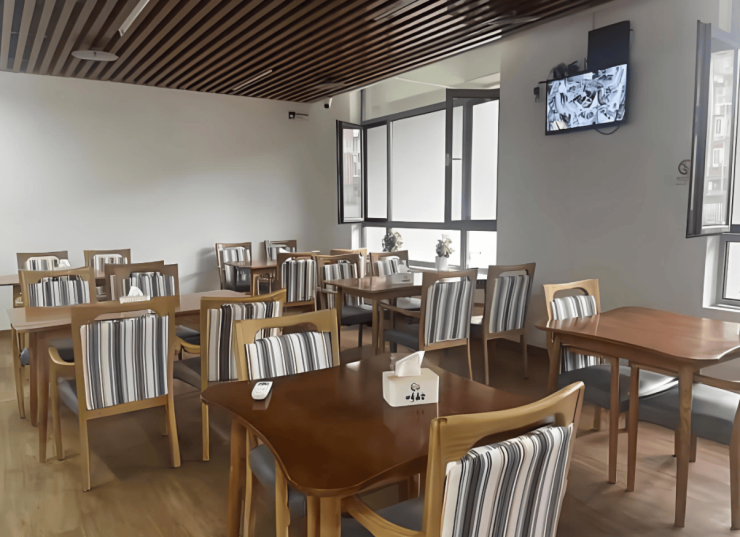 活力养老区:位于建筑低层,配备独立厨房、客厅和卧室,家具采用圆角设计,地面铺设防滑地砖,确保长者居住安全。房间内还设有紧急呼叫系统,24小时响应长者需求。