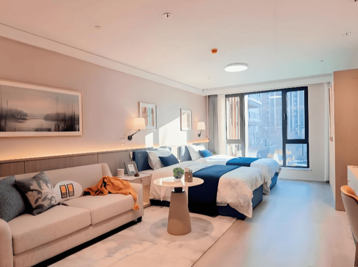 社区总建筑面积7.8万平方米,容积率仅1.5,绿化率超30%,采用"两轴九园"景观体系,春园樱花烂漫、夏园绿树成荫、秋园银杏金黄、冬园松柏常青,四季变换中尽显自然之美。6栋低密多层建筑规划近1000张床位,涵盖单人间(50-80㎡)、双人间(35-80㎡)及套房(80-120㎡),所有房型均配备新风除霾系统、中央净水系统、地暖及智能护理床。公共区域设8000平方米配套空间,包含医疗中心、康复中心、适老化KTV、门球场等设施,1.8米宽轮椅通道、无障碍电梯贯穿全社区,重点区域部署500个监控探头与毫米波雷达跌倒监测仪,检测精度达99.8%。
