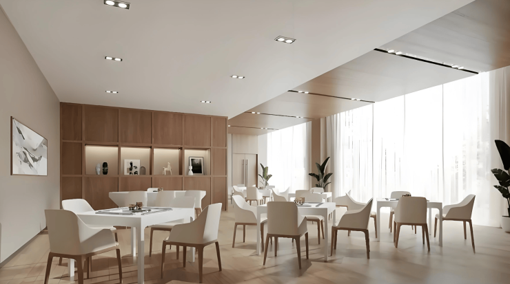 公共区域以“垂直四季+双首层”布局为核心:首层为活力长者活动区,设有四季门球场、智能健身区、社区咖啡馆及“四季剧场”;二层至四层为介护区,通过连廊连接屋顶四季花园与空中农庄。康复中心引进德国Lokomat下肢康复机器人、平衡测试训练系统等先进设备,由ISPRM认证康复师制定个性化方案。作为北京市“智慧养老院”建设试点,中心部署毫米波雷达跌倒监测系统(误报率<0.01%)、智能床垫(实时监测18项体征)等设备,自主研发的“长者健康数字画像系统”预警准确率达99.2%。