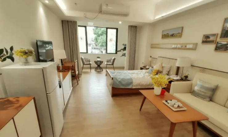 公寓总建筑面积3.5万平方米,规划251个房间、532张床位,涵盖单人间、双人间、四人间等多种户型,适配不同需求的长者。房间采用宽敞通透的空间布局,户户配备宽大阳台,兼顾采光与通风,为长者提供专属休憩观景空间。全屋融入全方位适老设计,防滑地砖、无障碍通道、圆角桌椅、卫浴扶手等细节配置一应俱全,房间内配备可遥控升降护理床、床头紧急呼叫装置,门上设置高低“猫眼”窗,全方位降低生活风险,新中式淡雅装修风格,营造出兼具舒适与温馨的居住氛围。