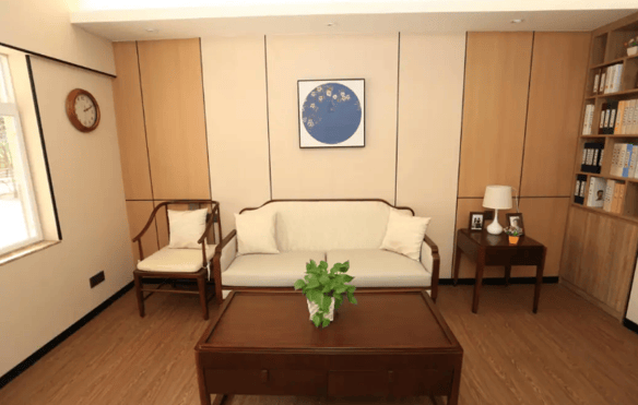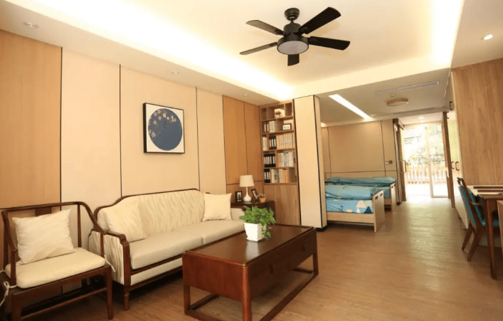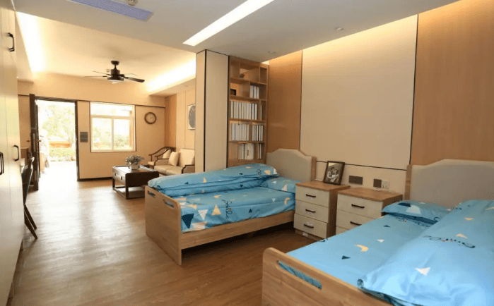 居住空间提供多种房型,单人间配备独立卫浴、智能护理床等适老化设施;双人间采用隔音玻璃隔断与分区储物柜;三人间标配防滑地胶等。所有房间配备独立冷暖空调等,每栋楼设有专用电梯及无障碍通道,公共区域形成无障碍通行网络。