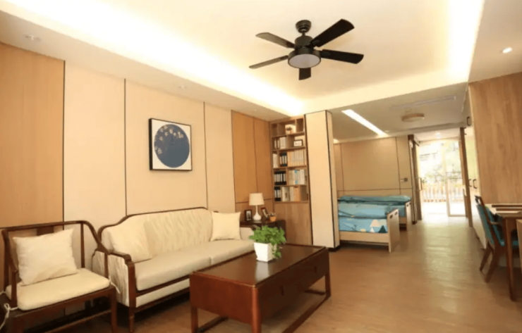 院区提供单人间、双人间、三人/四人房及套房四类房型,面积从15平方米至70平方米不等,可适配不同居住需求。所有房型均配备独立卫浴、冷暖空调、紧急呼叫系统及智能护理床,单人间增设负离子空气净化器,双人间采用隔音玻璃隔断设计,套房则配备客厅、厨房及观景阳台。公共区域与房间内贯穿45项适老细节,包括防滑系数≥0.85的地胶、L型扶手、V型防撞墙角等,同时部署毫米波雷达跌倒监测系统,全方位保障居住安全。