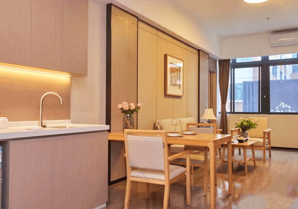 公寓总建筑面积达3.8万平方米,规划床位500张,科学划分自理区、半护理区、全护理区及认知症照护专区,实现分级照护与动态管理,精准匹配不同健康状况长者的居住需求。居住空间尽显人文关怀,提供30-120平方米的单人间、双人间及套房,均配备独立卫浴、智能护理床与负离子空气净化器,全屋采用防滑地砖与防撞角设计,卫生间安装助力扶手与恒温花洒,细节之处筑牢安全防线。