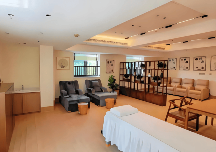 和熹会老年公寓总建筑面积达2.2万平方米,规划床位420张,采用“垂直功能分区”设计,满足不同健康状态长者的需求。活力养老区配备健身房、游泳池、影音室等设施,单人间面积25-35㎡,圆角家具、防滑地板、智能温控系统一应俱全,为自理长者提供独立生活的空间。失能照护区配置双护理床联动系统、医用级制氧机,医护配比达1:2.5,24小时提供压疮护理、鼻饲服务等专业照护。认知症专区采用“荷兰Hogeweyk疗法”,通过老式邮局、供销社等怀旧场景延缓病情发展,照护比例1:3,2024年功能改善率达83%。安宁疗护区则提供疼痛管理、心理疏导等全流程服务,让临终长者获得尊严与关怀。
