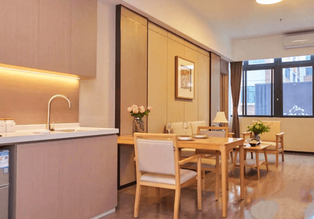 公寓内的居住空间均按照长者生活习惯进行适老化设计。户型多样,可满足不同长者的居住需求。房间内,高度适宜的床具和桌椅,让长者使用起来更加舒适;床边安装的安全扶手,为长者起身、行走提供有力支撑;卫生间采用防滑地砖与干湿分离设计,预留助浴设备安装空间,全方位保障长者安全。此外,独立空调、热水器、紧急呼叫系统等基础设施一应俱全,紧急呼叫装置直达护理站,确保长者需求能得到及时响应。