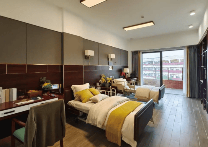 房间内采用L型扶手、倾斜镜、低位洗漱台等设计,降低跌倒风险;智能护理床支持一键升降,隔音玻璃保障隐私。所有房间配备独立卫浴与观景阳台,让长者尽享自然风光。