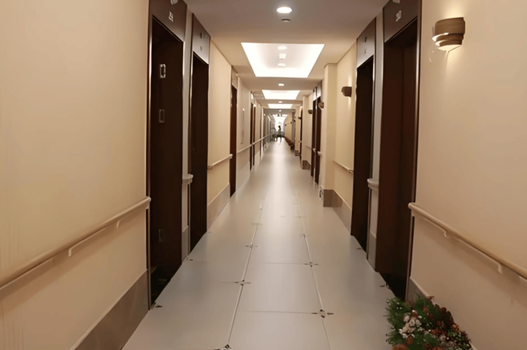 全院采用“基础适老+智慧适老”双重设计:走廊宽1.8米,铺设R12级防滑地胶,墙面安装L型扶手及红外感应夜灯;房间内配备智能床垫、恒温花洒及折叠助浴椅,细节处体现人性化关怀。六层建筑布局科学:一层设接待大厅与社区卫生服务站;二至五层为生活区,配备中央空调与智能温控系统;六层设康复训练中心及屋顶花园,实现“医疗-生态-人文”深度融合。