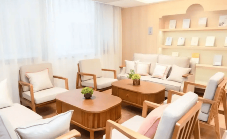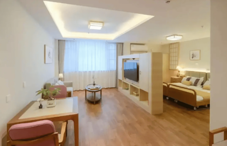 6000平方米的建筑空间内,59间居室以单人间、双人间及家庭套房形式呈现,满足不同家庭结构需求。单人间配备智能床垫与日本进口电动护理床,可实时监测生命体征;双人间采用分区储物设计,共享会客区配备适老化沙发;家庭套房增设独立厨房与无障碍阳台。全院采用圆角家具、防滑地胶及全覆盖扶手系统,将跌倒风险降低42%,公共区域绿植覆盖率达60%,屋顶康复花园种植本土木棉与鸡蛋花,营造四季有景的生态空间。