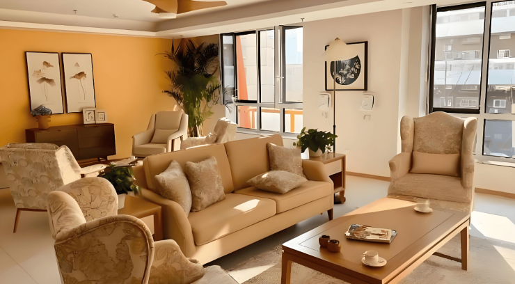 公寓总建筑面积约5000-12000平方米,核定床位210-227张,涵盖单人间、双人间及家庭套间。单人间25-35㎡,配备智能护理床、毫米波雷达跌倒监测仪及独立卫浴;双人间30-40㎡,采用可调节隔断设计,兼顾社交与隐私需求;家庭套间50-65㎡,含独立客厅及适老化厨房,适合夫妻同住或家属短期陪护。全楼无障碍设计贯穿细节,坡道宽度≥2.5米,扶手高度0.95米,轮椅通行率100%。公共区域设有棋牌书画室、书刊茶道区、互动体感游戏室等10余个功能区,中央空调与新风系统联动维持温湿度在22-25℃、40-60%,24小时空气净化系统确保环境质量抽检合格率达100%。