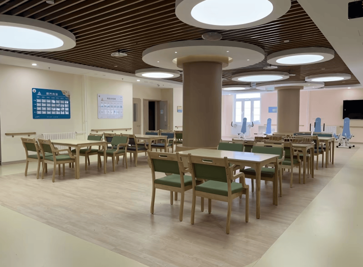 中心总建筑面积3940平方米,规划床位114张,涵盖单人间、双人间、多人间及认知症专区四种房型。居住单元采用“全场景适老化设计”:单人间30-40㎡配备电动护理床、智能马桶及毫米波雷达跌倒预警系统;双人间25-35㎡采用可旋转隔断设计保障私密性,床头集成氧气接口;多人间40-50㎡配置分区呼叫装置与防褥疮气垫床。公共区域构建“一核两厅三廊”布局:中央多功能厅配备4K激光投影与环绕立体声系统;康复厅引进德国MOTOmed下肢康复机器人与美国Biodex等速肌力训练系统;文娱长廊设VR虚拟现实体验室、数字书法台及手工坊。全楼铺设摩擦系数R12级防滑地胶,走廊宽度≥2.5米,双侧扶手距地0.95米且表面覆盖抗菌涂层,毫米波雷达跌倒监测系统实现离床监测响应时间≤3秒。