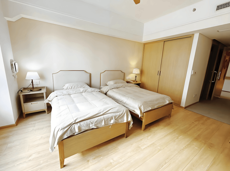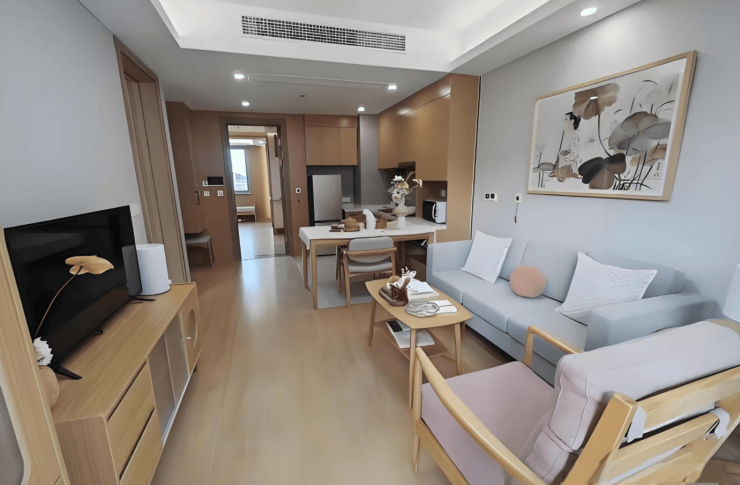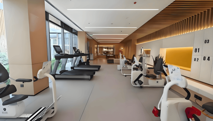 社区总建筑面积约2.1万平方米,绿化覆盖率高达57%,容积率仅1.6,呈现低密度宜居格局。建筑采用“半围合式”设计,地上五层配备6部电梯,设150余间房、293张床位,涵盖单人间(20-30㎡独立卫浴)、双人间(30-40㎡适老化设计)及套间(50-80㎡全屋地暖)。首层设24小时医疗中心、慢生活美学馆与日间照料中心,配备DR数字影像系统、便携式彩超,支持医保实时结算。五层800平方米多功能活动中心涵盖书画室、音乐厅、手工坊及康复训练室,配备智能步态训练仪与水疗设备。地下空间规划慢生活美学馆、小剧场及创意教室,地下一至三层为停车场。公共区域设置安全扶手、柔和照明及清晰导视标识,屋顶花园与下沉式庭院形成立体绿化景观。