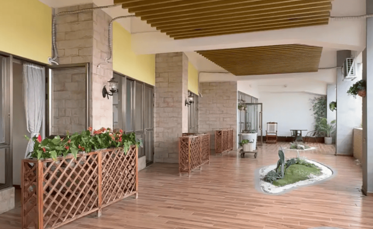 机构院内环境经过精心规划,整体布局通透合理,绿植覆盖率高,营造出温馨舒适的居家式氛围。院内功能区域划分清晰,除常规居住区域外,还设置了休闲活动厅、阅览区、康复锻炼区等多个公共空间,适配长者不同的日常活动需求。设施配置充分考量长者身体特点,公共区域全程无障碍设计,扶手、防滑地面等细节一应俱全,居住区域通风采光优良,为长者提供安全、舒适的居住生活环境。