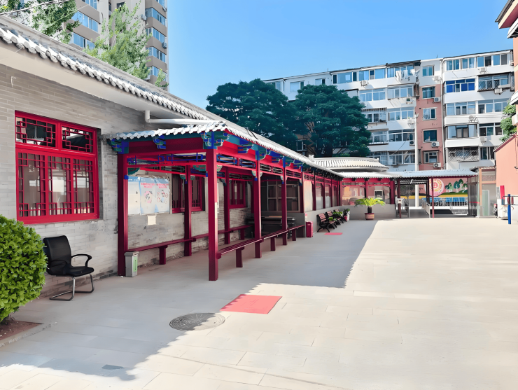 西罗园养老照料中心坐落于北京市丰台区西罗园街道西罗园一区,地处南二环与南三环之间,毗邻西罗园社区公园与凉水河生态带,形成“推窗见绿、下楼遛弯”的生态格局。院区占地约1.2万平方米,绿化覆盖率达35%,通过立体绿化技术打造“空中花园”与垂直绿墙,种植银杏、月季、紫薇等20余种适老化植物,夏季平均气温较周边低2-3℃。公共区域铺设防滑透水砖,设置无障碍坡道与双层扶手(高度80cm/90cm),夜间照明采用智能感应技术,照度均匀度达0.7以上。屋顶花园配备600米环园疗愈步道与智能健身桩,实时显示运动数据,让长者在城市中享受自然疗愈的静谧时光。