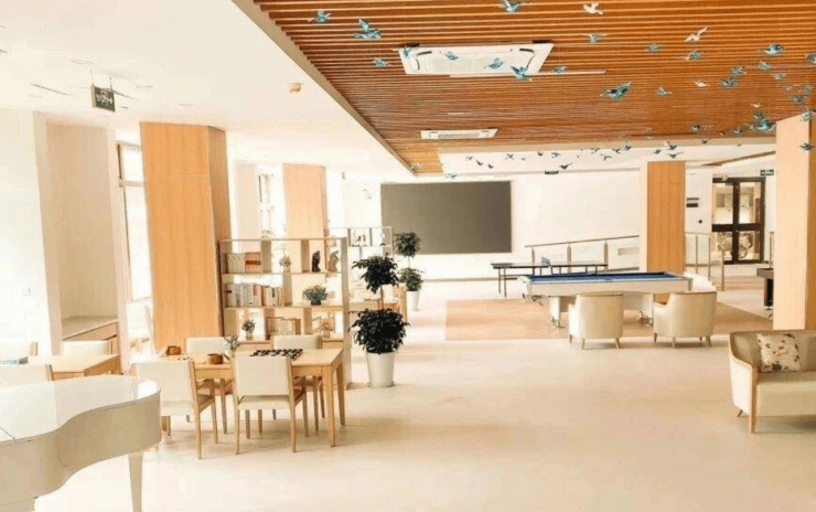 室内“功能美学”导向,单人间配独立卫浴与智能家居,双人间注重隐私,多人间强化收纳与安全呼叫。公共区域新风与 24 小时监控保健康。每层设就餐区、助浴房、会客室与护理台,600 平方米综合楼可办多样活动。
