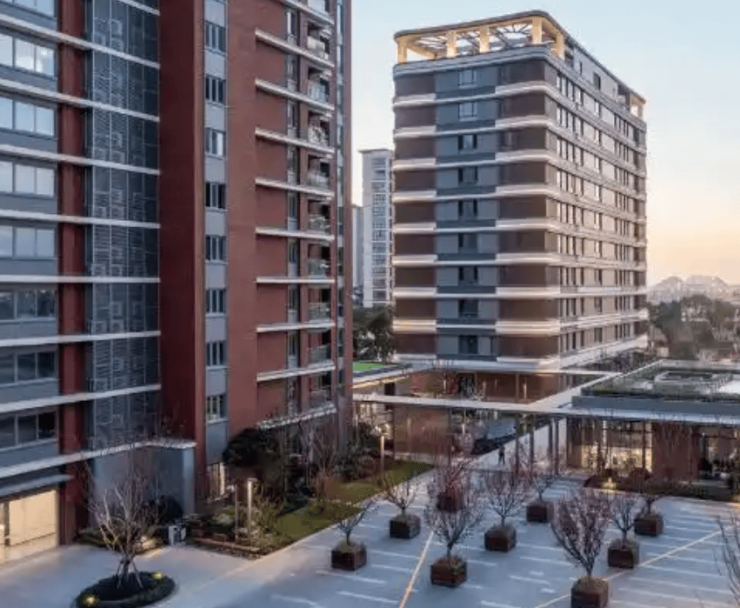 隽芳华养老社区规划清晰有序,一期建设364户活力公寓,二期规划455户,配套疗养中心可容纳近300名长者,逐步完善全周期养老服务体系。社区采用行列式布局,沿昆港公路打造2万平方米城市商业街区,西南角设置1栋10层护理院,内部排布7栋14层活力公寓,首层架空设计形成风雨连廊,无缝串联中央会所与各居住单元,雨雪天气出行也无需担忧。隽芳华养老社区的建筑风格独具特色,融合现代格栅元素与红色学院派设计,既传递出养老服务的温暖质感,又凭借明快线条保持视觉活力,打破传统养老社区的沉闷感。