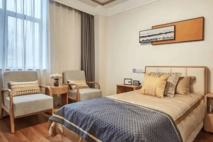 园区采用法式“回”字形建筑布局,由8栋风格统一的建筑围合而成,中央庭院设有喷泉、玫瑰花园与环形步道,绿化覆盖率达45%,营造出宁静雅致的居住氛围。室内空间规划科学,提供单人间、双人间及套房多种房型,单人间配备独立阳台与适老化书桌,双人间设置分区储物柜与共享会客区,套房增设独立厨房与家庭影院,所有房型均朝南设计,保障充足采光与通风。