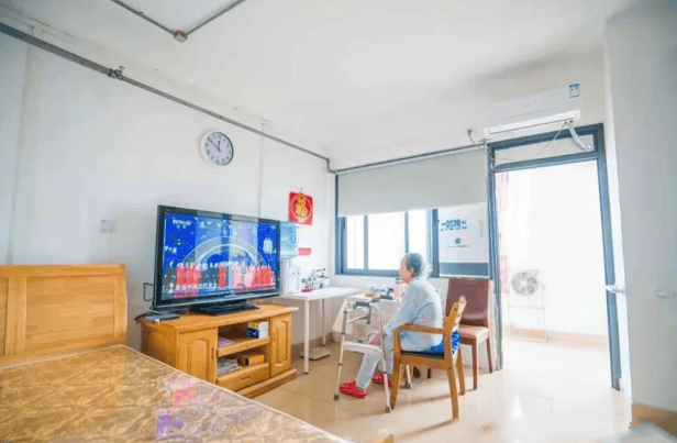 所有房间均配备品牌空调、32寸液晶电视、独立卫浴及紧急呼叫系统,采用圆角家具、防眩光照明及智能离床报警装置。走廊宽度达1.8米,满足轮椅通行需求。卫生间配置助浴椅、防滑扶手及双紧急呼叫装置,适老化设计获广东省养老机构标准化建设认证。
