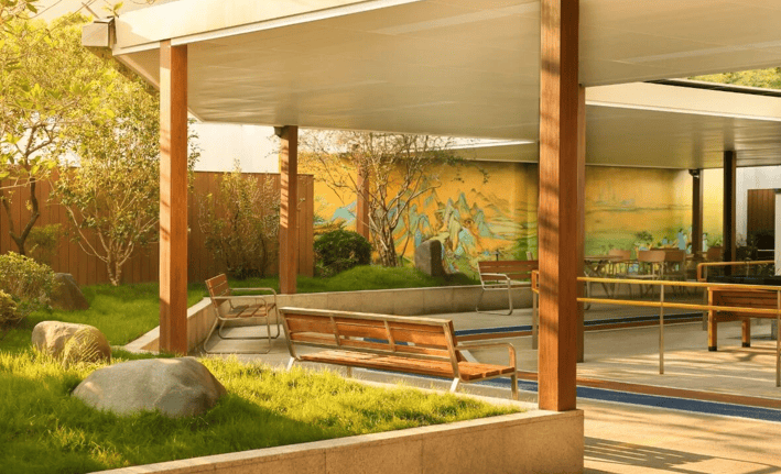 机构总建筑面积3.8万平方米,规划床位410张,以“小街区、密路网”理念构建功能分区。绿化覆盖率超65%,3000平方米中央花园内设环形健康步道、屋顶花园恒温泳池及药草种植园,PM2.5年均浓度低于20μg/m³,负氧离子浓度达2500个/cm³,形成“推窗见绿、出门入园”的生态康养环境。背靠天鹿湖森林公园,周边3公里内覆盖萝岗万达广场、科学城体育公园等商业休闲配套,与中山大学附属第三医院岭南医院、广州医科大学附属第五医院形成“15分钟医疗圈”,为长者提供全方位的生活保障。