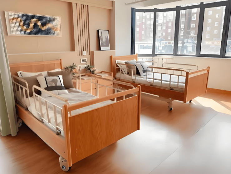总建筑面积3.2万平方米的院区采用"回"字形生态布局,规划200张适老化床位,涵盖单人间(35-45㎡)、双人间(45-60㎡)及豪华套房(60-80㎡)。居住空间严格遵循适老化设计:全院走廊宽度≥2.0米并设双侧扶手,地面铺设防滑系数0.95的PVC地胶,卫生间配置恒温花洒与紧急呼叫按钮。智能监护系统部署200个毫米波雷达跌倒监测仪,异常数据20秒内推送至护理端,AI健康管家实时监测心率、呼吸等数据,防跌倒率提升85%。
