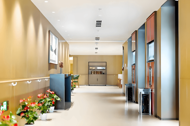社区总建筑面积约6万平方米,规划821张全周期适老床位,涵盖自理公寓、护理公寓及认知症专区三大功能板块。建筑采用“海派京韵”设计理念,外立面融合武康大楼摩登元素与北京胡同青砖朱墙的古典美学,内部打造“一核双带三园”景观体系:中央景观轴设镜面水景与健康步道,认知症疗愈花园种植32种芳香植物,屋顶生态农场年产出超5吨有机蔬菜直供食堂。房间配备医用级护理床、毫米波雷达跌倒监测仪及紧急呼叫系统,走廊宽度≥1.8米并安装双侧扶手,实现“零高差”通行。全楼宇部署3000个智能传感器,环境自适应系统将温湿度自动控制在22-26℃、40-60%RH,PM2.5过滤效率≥99.97%。