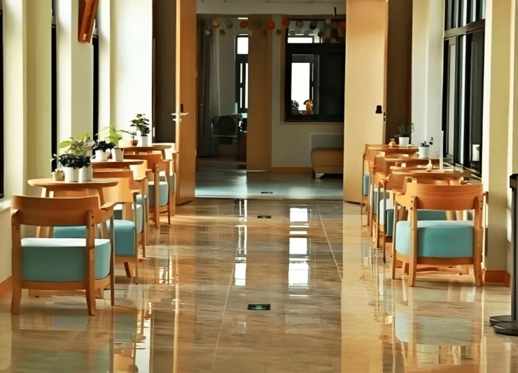 适老化细节渗透每个角落:全院无障碍通道宽度≥1.8米,地面采用防滑系数R13级的环保材料,走廊设置双层扶手与夜灯系统。家具边角均做圆角处理,卫生间配备恒温淋浴系统、助浴椅及紧急呼叫按钮。公共区域安装的24小时监控系统与毫米波雷达生命监测仪,实现3分钟异常值预警,确保长者安全无虞。