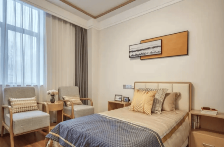 机构精心规划了单人间、双人间及套房三类房型,全面适配不同长者的居住需求。所有房型均采用朝南设计,保障充足采光与通风,室内配备可调节护理床、防眩光照明系统及独立阳台。认知症专区采用低饱和度色彩与定向照明设计,设置“记忆小屋”陈列怀旧物件,助力长者唤醒记忆。各类房型均配置分区储物柜与无障碍卫生间,恒温淋浴系统、智能马桶等设施进一步提升居住舒适度。