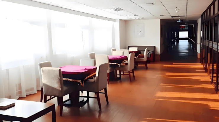 中心总建筑面积约1.97万平方米,规划床位600张,采用“院落式”布局,8栋低层建筑围合出3000平方米中央景观花园。居住区涵盖单人间、双人间及家庭套房,单人间35-45㎡配备独立卫浴、智能护理床及观景阳台;双人间采用分床设计兼顾私密与互动;家庭套房增设厨房与专属管家服务。所有房间铺设防滑石英石地砖,走廊宽度2米且双侧设连续扶手,坡道坡度≤1:15,床头与卫生间均安装紧急呼叫装置,5秒内响应。公共区域配置1000平方米康复广场、600平方米文化活动中心、助浴中心及洗衣房,康复设备引进德国进口品牌,文化活动中心设有书画室、棋牌室、手工坊及多功能厅,屋顶花园种植适老花卉,连廊设计串联各功能区,形成“移步换景”的适老空间体系。