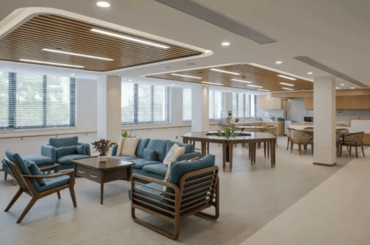 公寓总建筑面积达5772平方米,规划设置140张标准化养老床位,涵盖单人间、双人间及VIP套房三种户型,可全面适配不同长者的居住需求。床位布局科学合理,按功能划分为四大照护区域,分别对应自理、半失能、失能及认知症长者,各区域相对独立又互联互通,既保障长者隐私,又便于护理人员开展工作。所有区域均配备中央空调、地暖及新风系统,确保室内温湿度恒定舒适;床间距严格遵循≥1.2米的标准,兼顾通行便捷与护理操作需求,全方位保障长者居住的舒适度与安全性。