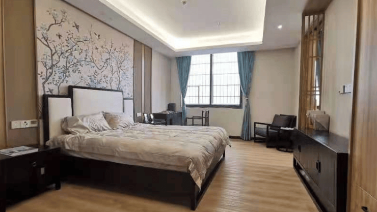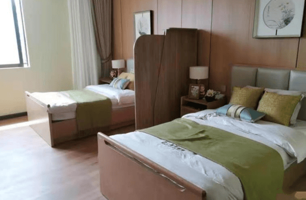 适老化配置细致入微,全屋采用圆角家具、防滑地砖、无障碍卫生间,床头设有紧急呼叫按钮与氧气接口,卫生间安装扶手、恒温花洒及智能马桶,单人间还配备迷你冰箱,全方位满足长者日常需求。智能设备也一应俱全,智能手环实时监测健康数据,红外感应系统保障夜间安全。
