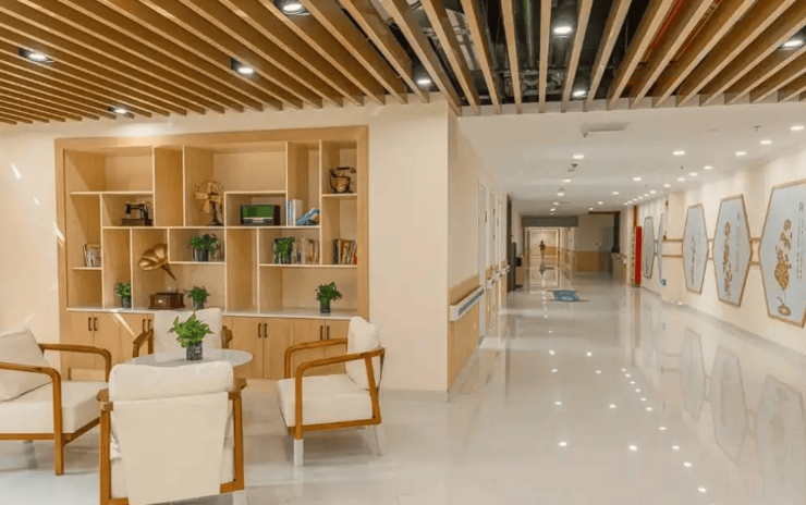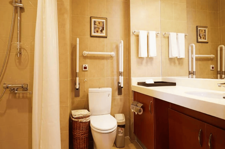 单人间配智能护理床、独立卫浴、紧急呼叫系统;公共区域双层扶手、防滑地胶,走廊宽度1.8米满足轮椅通行。