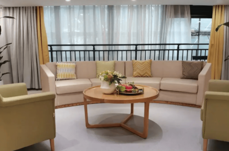 社区总建筑面积3.5万平方米,由12层养老公寓与6层二级康复医院组成。公寓内部空间以“安全、舒适、尊严”为设计原则,规划251间居住单元,涵盖35-120平方米的双人间、四人间及江景套房。所有房间均配备独立卫浴、分床设计及毫米波跌倒监测仪,户户南向的布局确保充足采光,270°环幕阳台与6个楼层的空中花园形成垂直绿化系统,让长者在室内外均可享受自然景致。公共区域则通过防滑地面、无障碍通道、智能紧急呼叫系统等细节,将适老化理念渗透至每一寸空间。