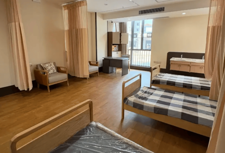 总建筑面积3.8万平方米的园区内,规划了410张床位,涵盖单人间、双人间及套间三大类房型。单人间面积25-45㎡,配备独立卫浴与智能温控系统;双人间床间距超1.2米,采用防滑地胶与弧形边角家具;套间增设会客区与独立厨房,面积达60-80㎡。所有房型均配置三重紧急呼叫系统(拉绳报警+手环定位+AI跌倒监测),毫米波雷达跌倒监测仪实现24小时行为轨迹追踪。建筑采用“小街区、密路网”理念,通过42项适老化细节设计,使跌倒事故率同比下降58%。