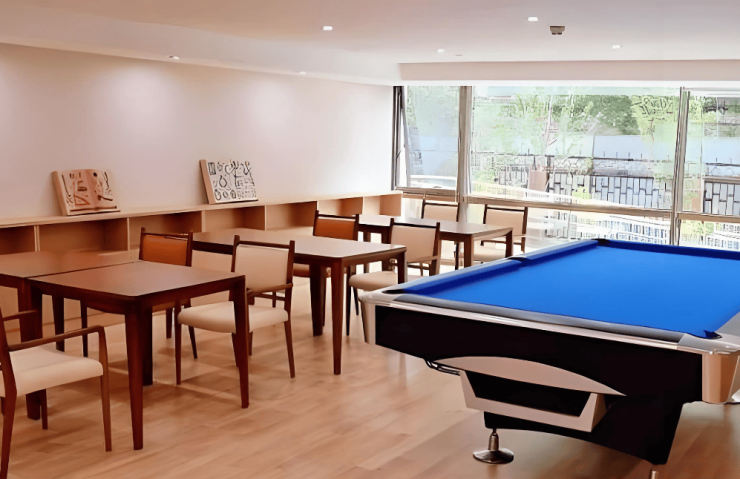 社区总建筑面积4.2万平方米,规划养老公寓600余套,采用“一轴三带多点”生态景观体系。中央银杏大道串联雨水花园与健身步道,两侧分布认知症疗愈花园、亲子互动区及宠物友好空间。单人间32-38㎡配备智能护理床、独立卫浴及新风系统;双人间64㎡采用防撞软包设计,床间距≥2.2米;套房66-80㎡含独立客厅厨房,支持三代同堂短期居住。公共区域包括3000㎡活力中心,整合书法室、棋牌室、舞蹈房等15个功能区,并设有200人规模多功能厅。全楼部署毫米波雷达跌倒监测系统,响应时间≤0.3秒,智能手环实时同步生命体征数据至家属APP。
