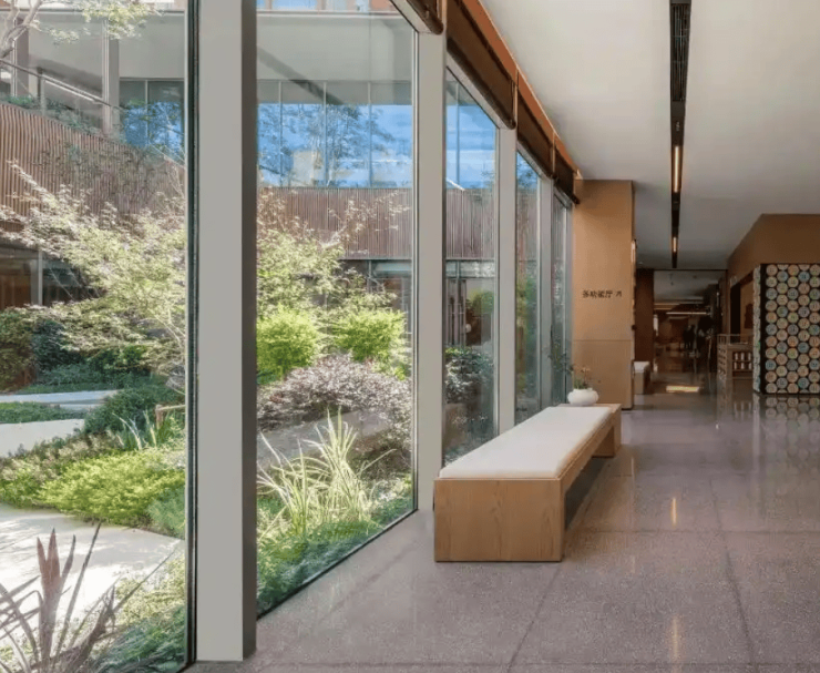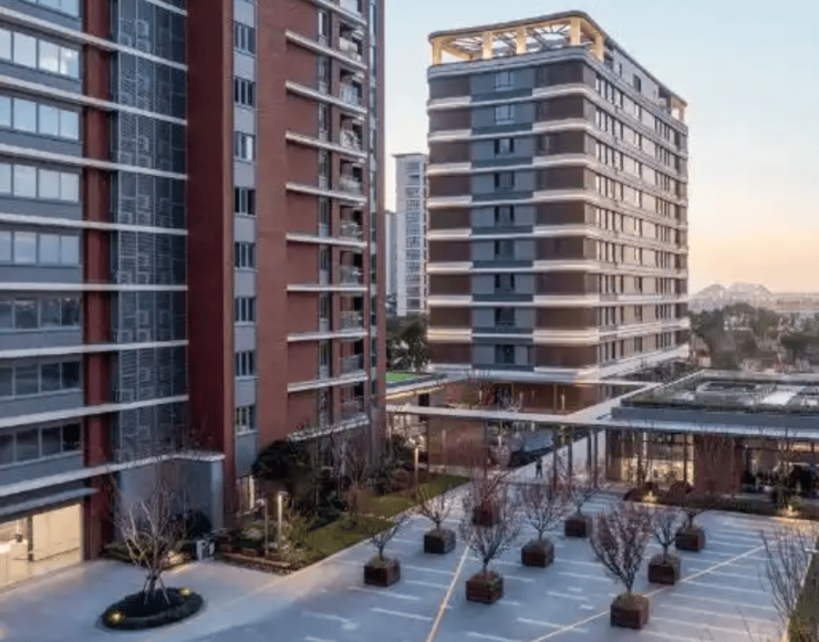 隽芳华养老社区在建筑风格上独具匠心,巧妙融合现代格栅元素与红色学院派设计,打造出兼具服务温度与视觉活力的建筑风貌。现代格栅元素的运用,不仅优化了建筑的采光与通风效果,让居住空间更显通透舒适,还增添了建筑的现代质感;红色学院派设计则自带沉稳温润的气质,传递出温馨亲切的氛围,消解了传统养老机构的冰冷感,让长者感受到家的温暖。两种风格的融合,既满足了长者对居住环境安全性、舒适性的基本需求,又通过鲜活的视觉设计营造出充满活力的社区氛围,打破了人们对养老社区的刻板印象,让晚年生活空间更具美感与生命力。