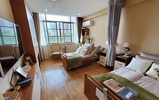 所有房间均采用圆弧边角家具、防滑地板及L型扶手,卫浴间配备无障碍洗手池、暖风设备及紧急呼叫系统。60%以上房间为全景落地窗设计,江景房型可直接俯瞰珠江,室内以新中式风格为主调,搭配国画书法装饰,营造典雅舒心的居家氛围。部分房型还设有独立厨房与阳台,满足家属陪护或短期居住需求。