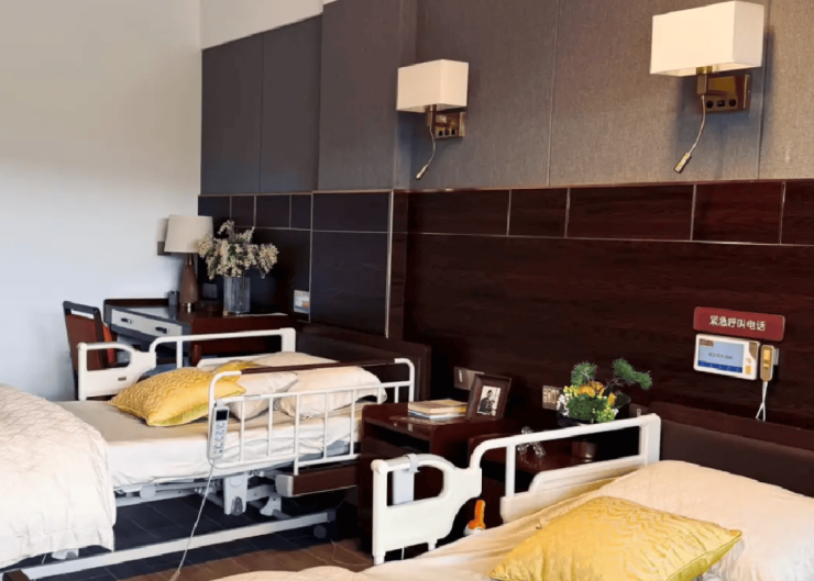 中心总建筑面积约3万平方米,规划有300张养老床位,涵盖单人间、双人间及套房三种个性化房型,适配不同居住需求。所有空间均贯穿45项适老化细节设计,防滑系数≥0.85的地胶从根源降低跌倒风险,L型扶手、倾斜镜与低位洗手台贴合长者使用习惯,智能护理床支持一键升降与体位调节,兼顾功能性与尊严感。双人间采用隔音玻璃隔断与分区储物柜保障隐私,套房则增设独立厨房与家庭影院,满足家属短期陪护的需求。