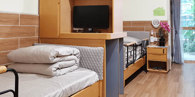 双人间面积在25 - 45平方米,采用分床设计,既保证了长者之间的相互陪伴,又兼顾了各自的隐私。房间内配置了双控空调,长者可以根据自己的需求调节温度;储物柜为长者提供了充足的收纳空间;可调节护理床能够满足不同长者的身体需求;床间距≥1.1米,保证了长者在房间内活动的空间,避免了相互干扰。这种房型兼顾了隐私与经济性,适合大多数长者选择。
