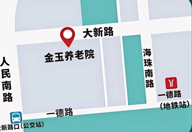 导航提示:建议使用高德地图搜索"金玉养老院",选择"大新路419号"目的地,地铁出行可在一德路站B口出站后沿大新路向东步行,公交8路、86路至大新西站下车即达。院内设有无障碍通道及临时停车区,方便家属探视接送。