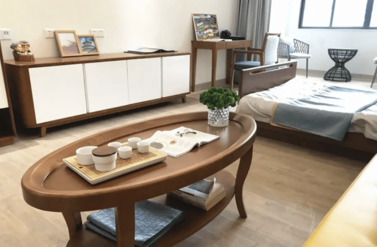 整体采用新中式装修风格,色调淡雅温馨,营造出“比家更舒适,比机构更像家”的居住氛围。室内外全面落实适老化设计,包括防滑地面、无障碍通道、圆角桌椅、卫浴间扶手等细节配置;房间内配备可遥控升降的电动护理床,床头柜设置紧急呼叫座机,门上配备高低“猫眼”窗,全方位降低生活风险。全院绿化率达32.3%,让绿意与鲜氧融入日常生活。