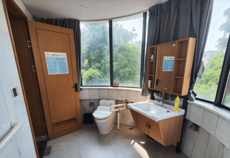 全院规划了单人间、双人间及三人间共88张床位,充分考虑了不同长者的居住需求和习惯。无论是喜欢独处的长者,还是希望与他人相伴的长者,都能在这里找到适合自己的居住空间。房间内的设计更是细致入微,每一处细节都体现了对长者们的关怀和照顾。独立卫浴配备了防滑地胶,有效防止长者们在洗澡或如厕时滑倒摔伤;L型扶手为长者们提供了稳定的支撑,让他们在起身、坐下或行走时更加安全;倾斜镜的设计则考虑到了认知症长者可能出现的空间感知错位问题,降低了他们因视觉误差而产生的恐慌。