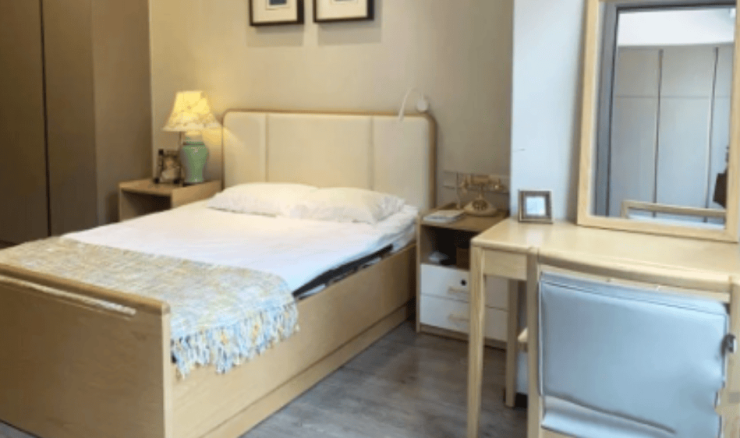 居住空间:所有房间均采用无障碍设计,配备防滑地砖、圆角防撞家具、安全扶手及紧急呼叫系统。单人间面积20-25平方米,设独立卫浴、智能护理床、新风系统;家庭套房面积40-45平方米,增设客厅、厨房及无障碍阳台,满足“代际同住”需求。房间装饰融入岭南社区元素,如趟栊门造型的衣柜门、满洲窗装饰的床头背景墙、广绣挂画等,让长者感受“家”的温暖。