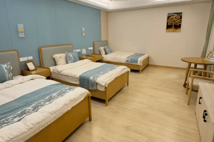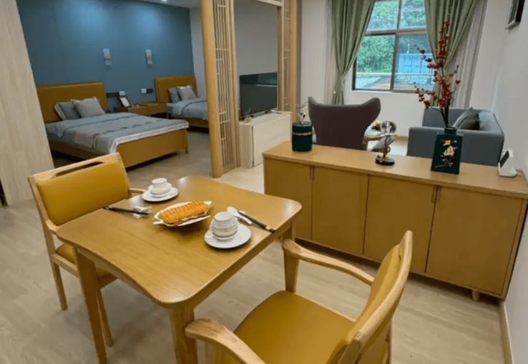 建筑采用连廊贯通设计,将医疗区与养老区无缝衔接,形成“楼上治病、楼下养老”的立体化服务格局。所有房间均遵循无障碍标准:医用级防滑地板、圆角家具、双层扶手走廊、恒温浴霸与助浴椅等细节设计,从根源降低跌倒风险。单人间配备全景落地窗与独立卫浴,支持语音控制灯光空调;双人间朝南布局采光充足;公共区域加宽电梯与防走失定位系统,兼顾行动自由与安全保障。这种“以长者为中心”的空间逻辑,让科技温度渗透至每一寸生活场景。
