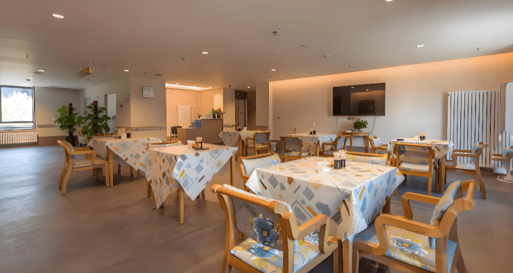 居住空间:涵盖单人间(25-50㎡)、双人间(30-40㎡)及套间(60-80㎡),均为南北朝向,采用无醛装修材料与静音门窗。室内配备智能温控、紧急呼叫装置、可调节护理床等60余项适老细节,卫生间实现干湿分离与防滑处理,公共区域设置1.8米宽无障碍走廊与双层扶手,从硬件层面筑牢安全舒适防线。