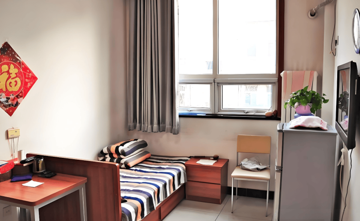 公寓总建筑面积约2.7万平方米,绿化覆盖率超70%,PM2.5浓度较市区低60%,负氧离子浓度达2000个/cm³,形成天然“都市氧吧”。建筑采用扇形布局融合传统京派庄重感与现代极简美学,外立面线条简洁大气。居住空间涵盖单人间(25-35㎡)、双人间(32-40㎡)、夫妻套间(60-80㎡)及特护套房(100㎡起),均配备独立卫浴、智能护理床、紧急呼叫系统及适老化家具。全院采用“基础适老+智慧适老”双重设计:走廊宽1.8米,铺设防滑系数R12级PVC地板,安装L型扶手及红外感应夜灯;公共区域门宽1.2米,配置智能温控设备与空气净化系统。中央设4200㎡生态花园、五感花园及300米樱花慢行步道,四季有景,步移景异。