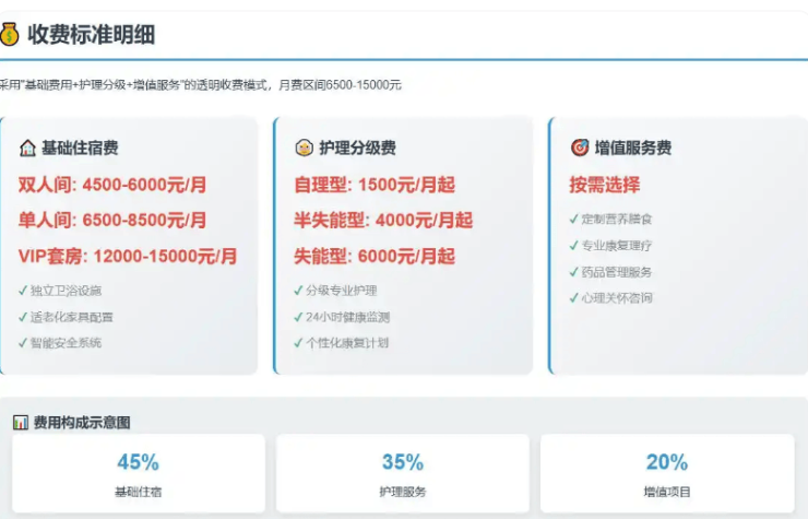 护理院采用“基础费用 + 护理分级 + 增值服务”模式,月费6500元至15000元,具体如下: