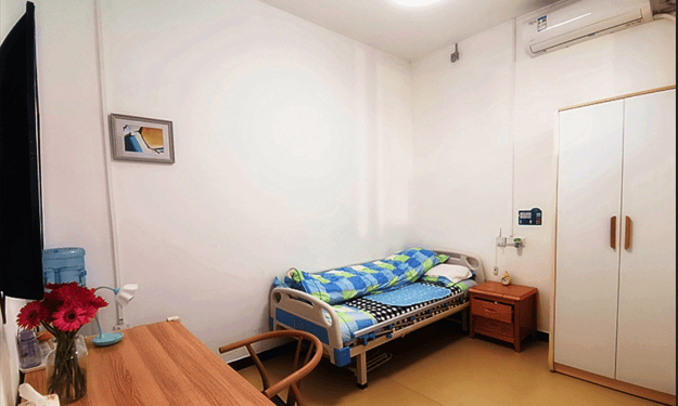 房型选择:提供单人间(28-65㎡)、双人间(35-45㎡)、VIP套间(60-80㎡),均配备智能床垫、离床感应器、紧急呼叫系统。房间内家具边角圆润处理,地面铺设防滑PVC材质,卫生间配置助浴椅、防滑扶手及紧急报警装置,全院采用中央过滤直饮水系统。