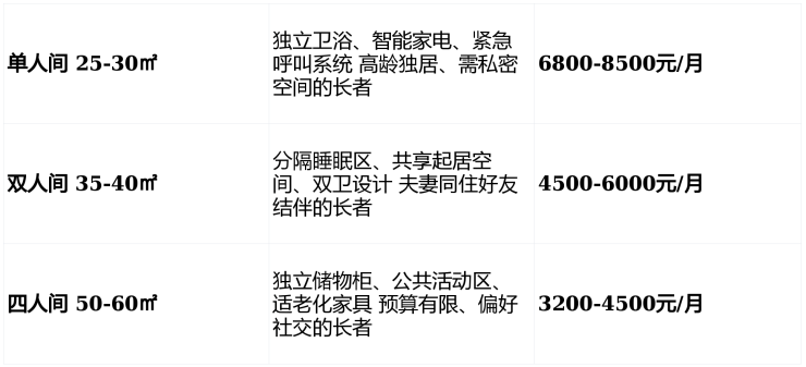 偏好社交或私密的长者:双人间/四人间满足社交需求,单人间提供独立空间。