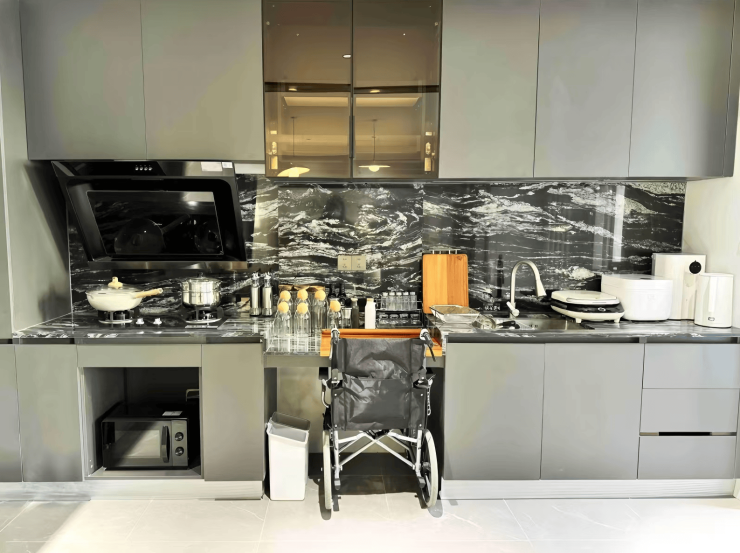 社区总占地35万平方米,绿化覆盖率超70%,种植50余种景观植被,形成立体化生态体系。3万㎡慢谷公园包含网球场、门球场、垂钓园、书画院等20余个功能场馆,5000㎡空中花园与800㎡认知症花园为长者提供专属活动空间。居住区采用“一核三带多组团”空间结构:活力长者区占比40%,配备智能手环充电站、无障碍电梯及园艺工坊,支持自理老人参与书法、摄影、合唱等108门老年大学课程;介护专区占比35%,单人间占比70%,增设医用级护理床及智能体征监测仪,护患比1:3;认知症照护单元采用“怀旧疗法”设计,配置老式收音机、织布机等触发记忆物件,护患比1:2;特护专区配备心电监护仪、呼吸机等急救设备,提供鼻饲护理及深度压疮管理。所有居室采用无障碍设计,标配地暖空调、适老卫浴、智能家居系统,卫浴间安装L型扶手、折叠助浴椅及恒温花洒,紧急呼叫响应时间≤15秒。