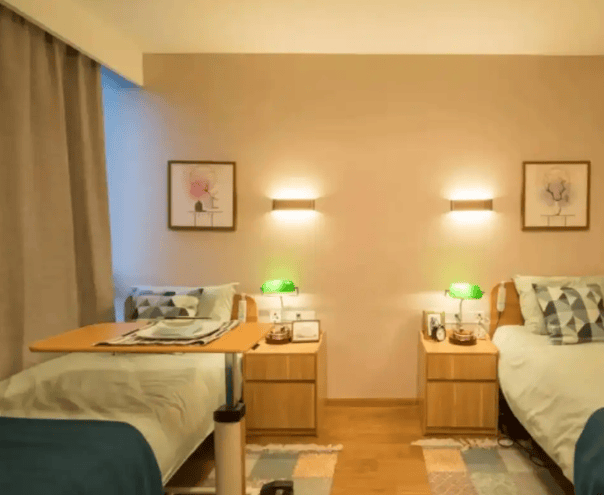 房间内的适老化设计更是细致入微,铺设防滑地砖,有效规避长者滑倒风险;安装安全扶手,为长者起身、洗漱提供支撑;配备紧急呼叫系统,一旦长者出现紧急情况,可快速呼叫工作人员求助;同时配备中央空调与新风系统,保障房间内温度适宜、空气清新,全方位确保长者居住环境的舒适与安全。此外,五楼设有400平方米绿色空中露台,铺设防滑步道并配置休闲座椅,为长者提供了室外散步、轻度运动的专属空间。