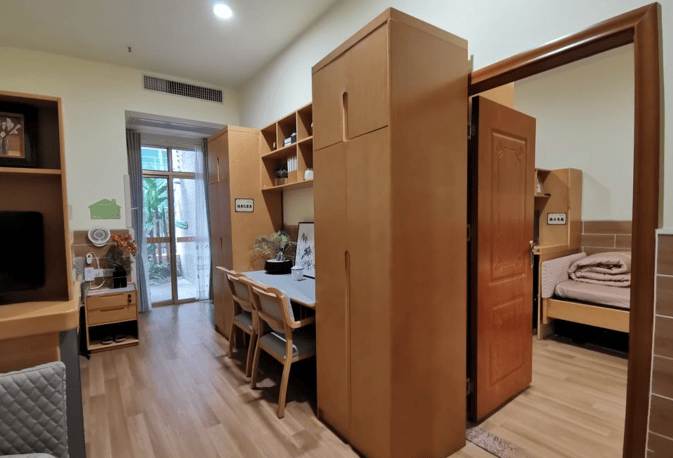 居住房型丰富多样,有单人间、双人间及多人房,能满足不同长者的居住需求。单人间面积30 - 35㎡,空间宽敞明亮,通风良好,让长者拥有独立的私人空间。双人间采用分床设计,充分保障了长者的隐私。所有房间均配备了适老化设施,多功能升降床方便长者根据自身需求调整高度;独立卫浴让长者使用更加便捷;防滑地胶和恒温花洒保障了长者洗浴时的安全;紧急呼叫系统则为长者的生命安全保驾护航。